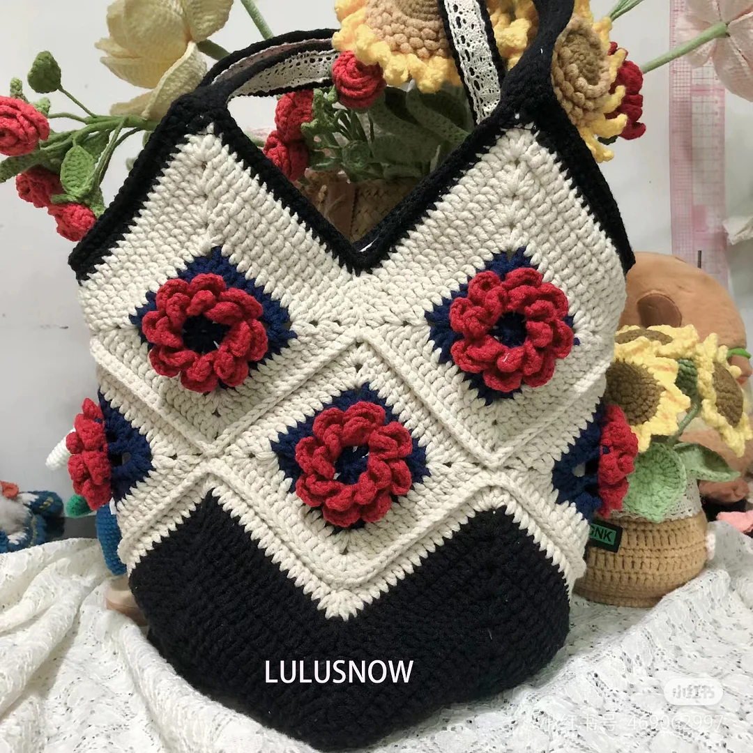 Lulusnow Handmade Black Red Rose Granny Square Beach Bag Crochet Tote Bag Shoulder Bag