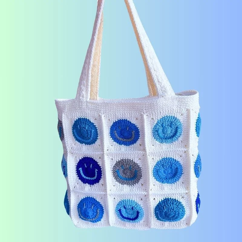 Lulusnow Handmade Blue Smiley Faces Granny Square Crochet Tote Bag Shoulder Bag