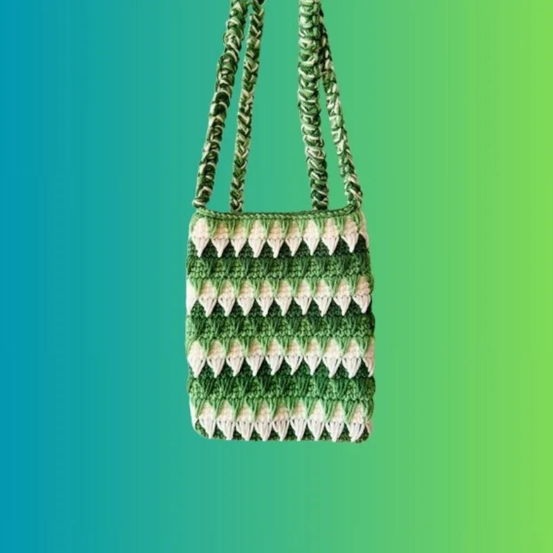 This hand-crocheted bag showcases a classic green and white striped design. Combining high-quality materials with skilled crochet techniques, this bag offers a unique blend of style and functionality.