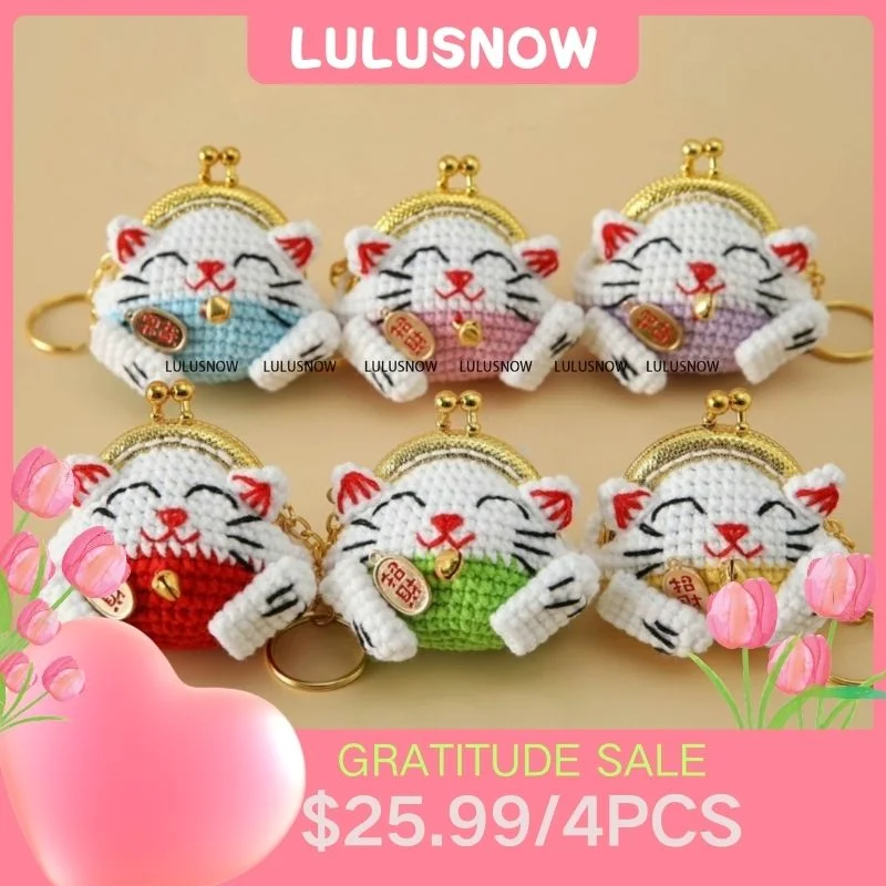 Lulusnow Handmade  Kawaii gift Japanese Maneki Neko Lucky Cats Crochet Coin Purse Keychain Bag Pendant Gift for Her/Friend/Kids