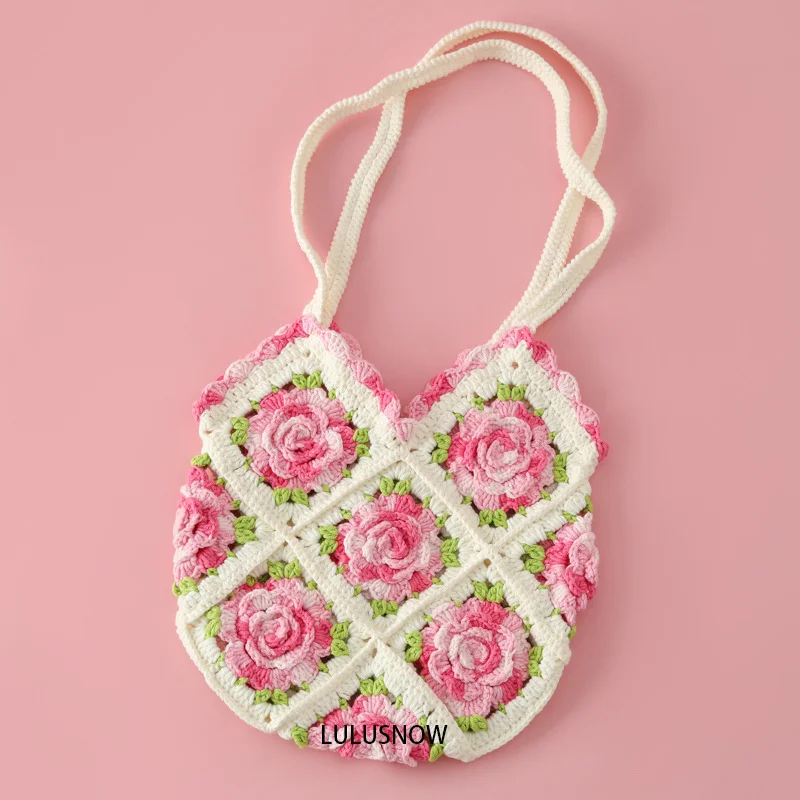 Lulusnow Handmade Pink 3D Rose Granny Square Crochet Tote Bag Shoulder Bag  Gift Christmas/Valentine's/Easter
