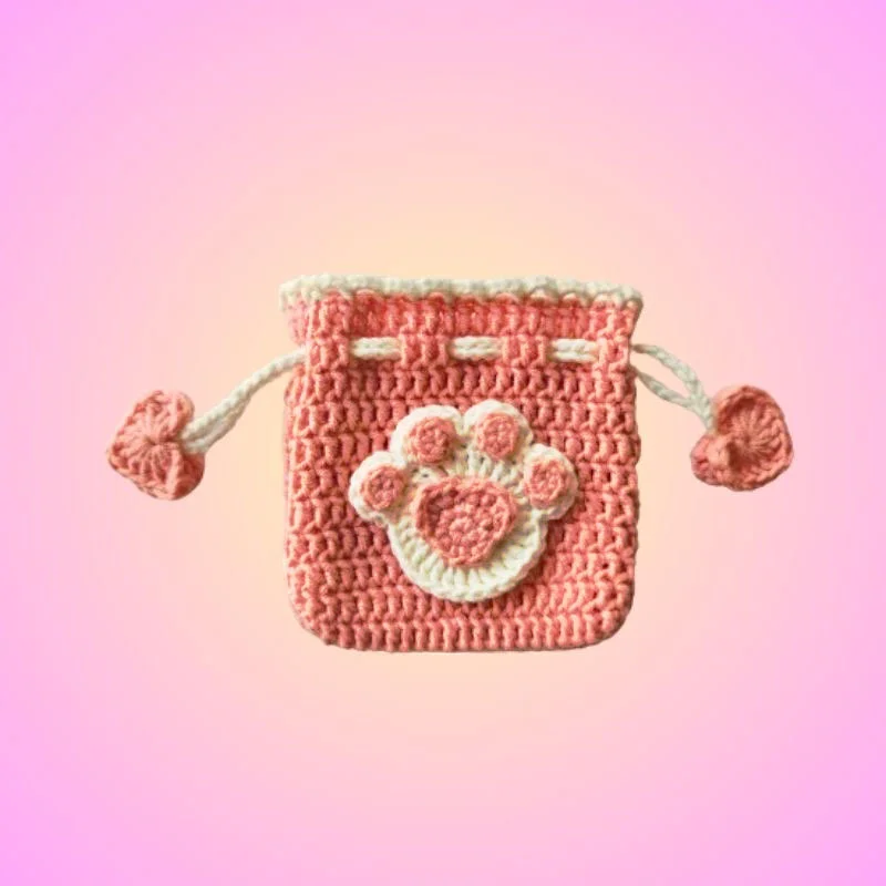 This hand-crocheted mini drawstring bag is a cute and unique accessory, with a pink body and a cute pink cat paw.