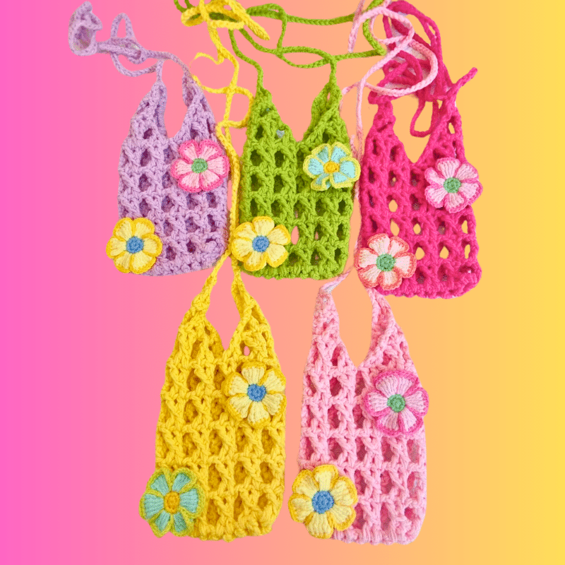 This handcrafted crochet crossbody bag embodies the fresh vibe of summer with its bright colors. Adorned with two vibrant flowers on the surface, it exudes a lively and enthusiastic charm. Whether paired with lightweight summer attire or given as a gift to a friend, it is an excellent choice.