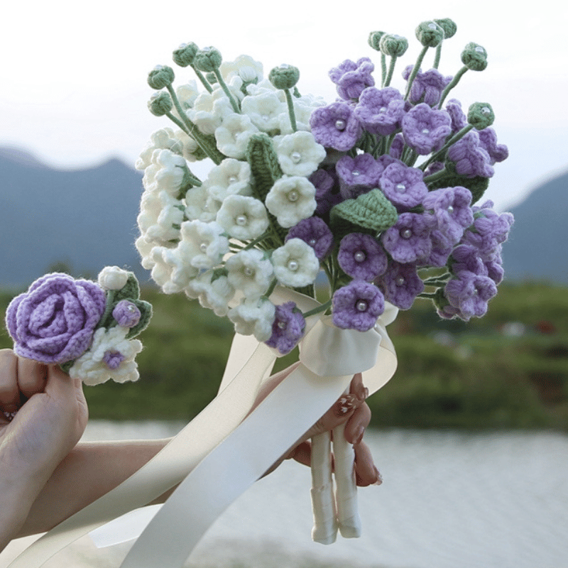 Lulusnow Handmade White Purple Pearl Lily Of The Valley Flower Bell Orchid Crochet Flower Bouquet Wedding/Forever Loving Girlfriend/Wife/Bride Gift